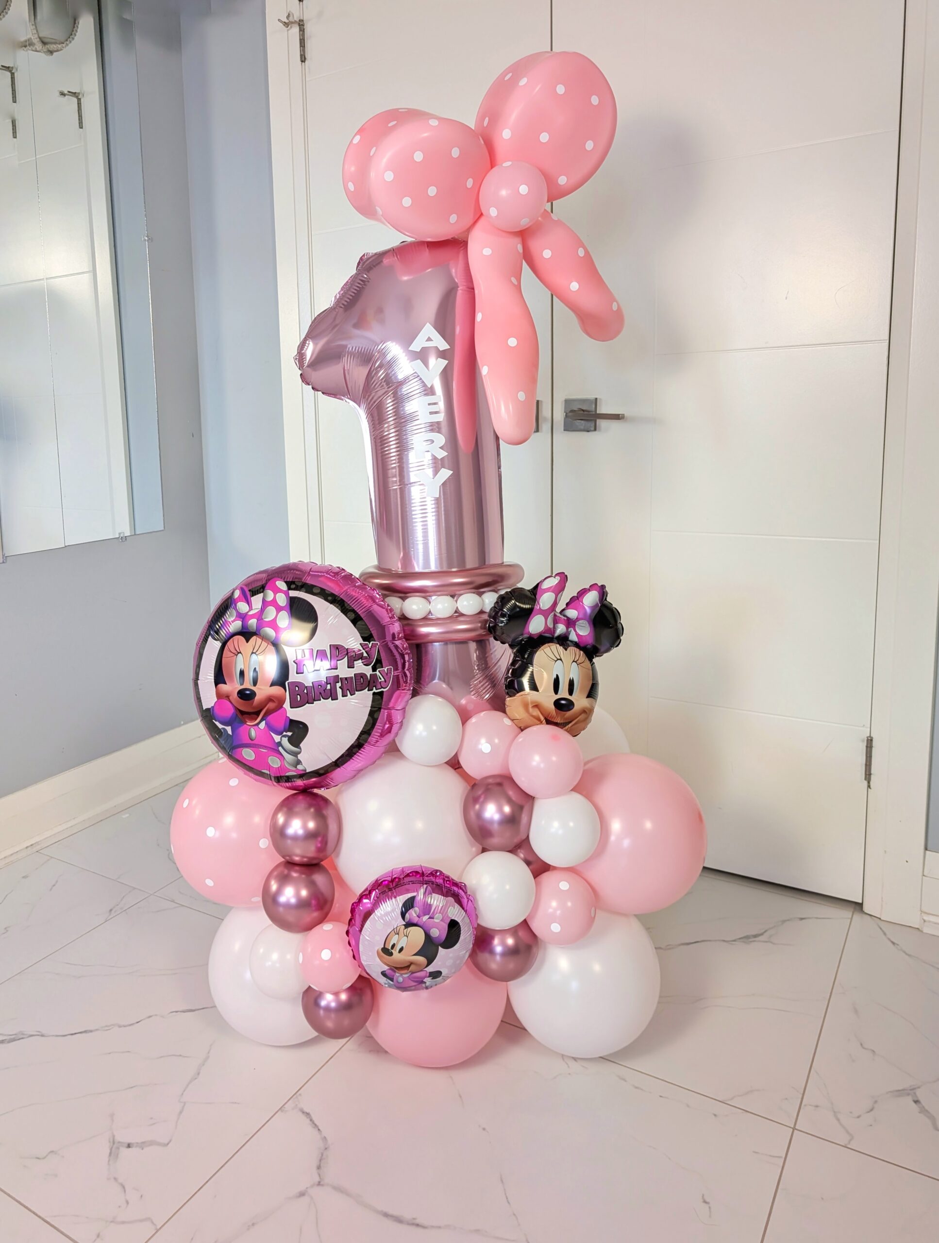 Each stack comes with one number balloon; additional digits can be added for a small fee. Whether it’s for a 1st birthday or a sweet sixteen, this balloon stack adds that bow-tiful Minnie magic to the celebration!