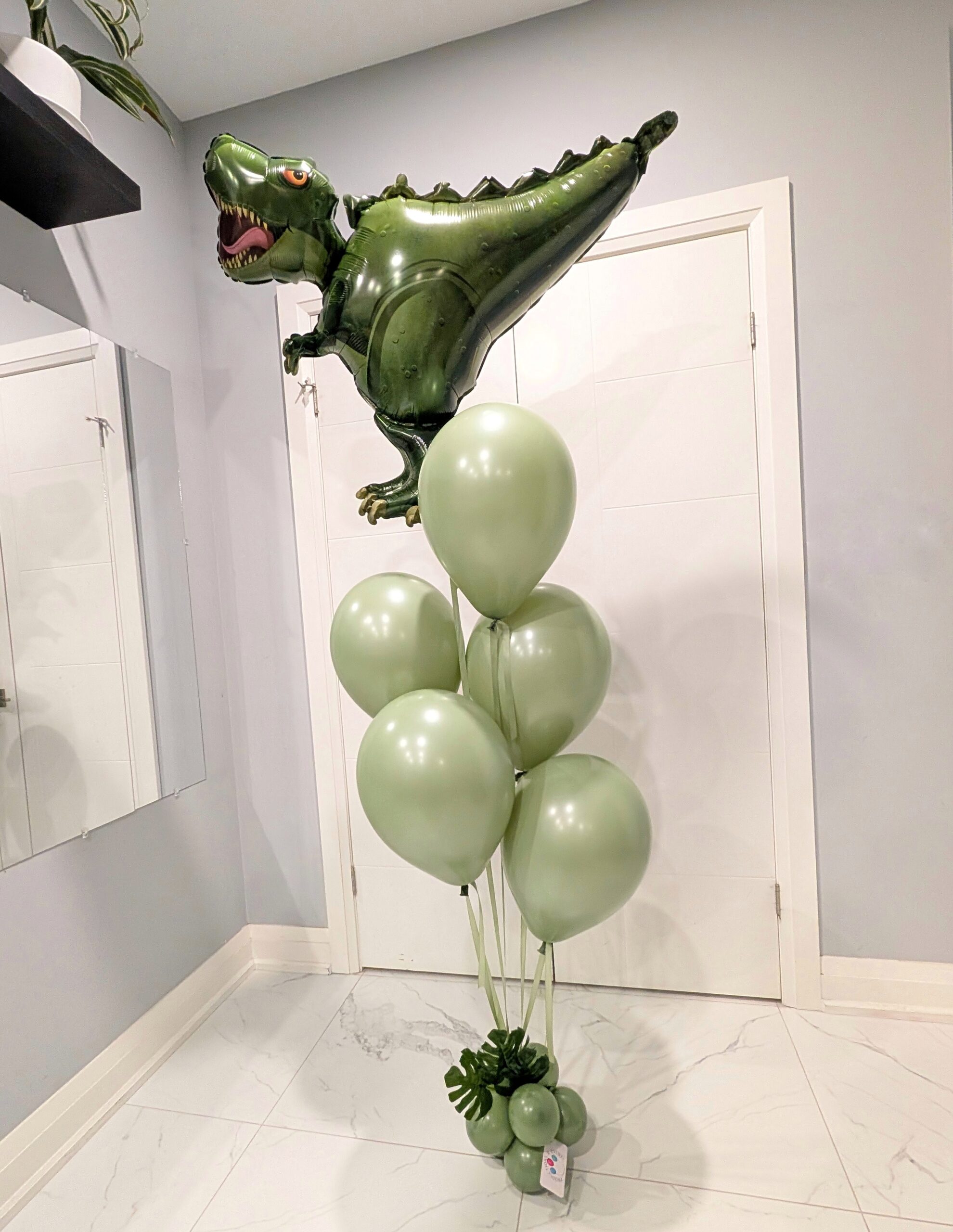 The Dino Roar Birthday Helium Bouquet is a fun, polished choice for dinosaur-themed parties and modern birthday celebrations. With a bold dinosaur foil balloon floating above a cluster of soft sage green latex balloons, this arrangement feels playful while still looking clean and styled.