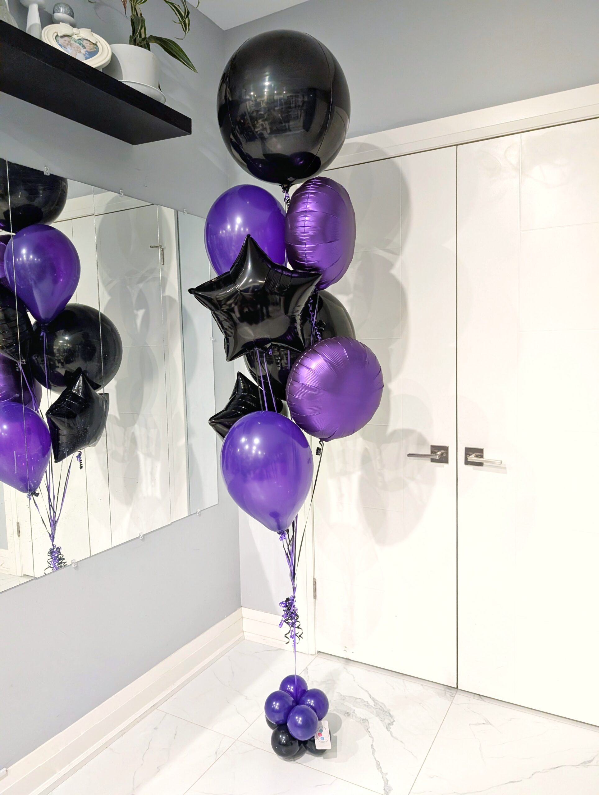 The Midnight Amethyst Helium Bouquet brings together glossy black and rich purple balloons for a modern, dramatic look. With a mix of rounded balloons and star-shaped foil accents, this arrangement feels polished without being overdone.