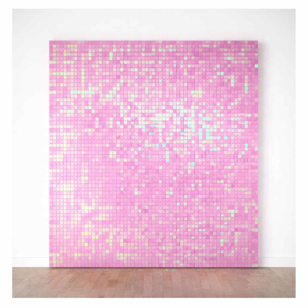 The pink shimmer wall exudes romance and warmth with its gentle hue. It’s perfect for weddings, baby showers, or any event where a soft, inviting backdrop is desired. The reflective squares catch the light beautifully, creating a dreamy and whimsical effect that guests will love.