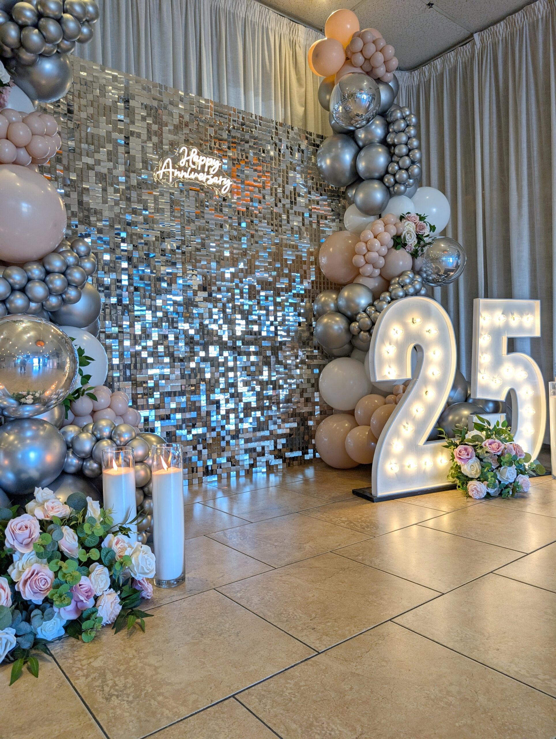 Our silver shimmer wall rentals feature a myriad of small, reflective squares that dance and flicker under the light. This wall provides a sophisticated and modern backdrop, ideal for corporate events, milestone celebrations, or any gathering where you want to add a sleek, contemporary touch.