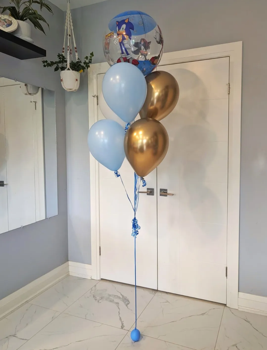 Surrounding the orb balloon are light blue and metallic gold latex balloons, creating a modern and energetic colour palette. The blue ties directly into Sonic’s signature look, while the metallic gold balloons add a premium, elevated feel that works well for both kids’ parties and stylish gaming celebrations.
