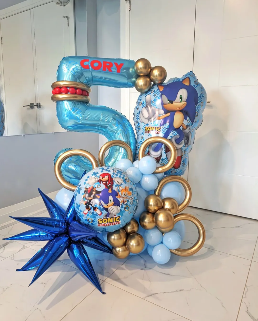 Race into party fun with the Super Sonic Speed Birthday Stack. This high-energy balloon design is inspired by the fast-paced world of Sonic and features bold blue tones, gold ring accents, and playful character details that make it a standout centrepiece.